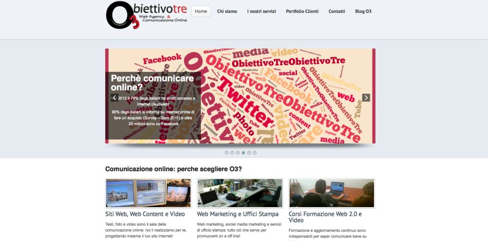 ObiettivoTre è uno Studio Associato di Giornalisti Multimediali, fondato da tre giornaliste professionisteblogger di Firenze, che si occupa di comunicazione per enti pubblici o aziende private: abbiamo realizzato un sito apposito, O3 Web Agency, dedicato al nostro lavoro!