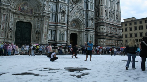 Il maltempo si è poi spostato verso l’interno colpendo in particolare la zona di Firenze: una violenta bomba d’acqua, accompagnata da una fitta grandinata che ha imbiancato le strade, ha colpito il capoluogo toscano, creando danni e disagi.