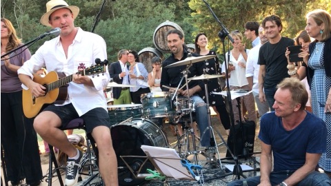 Poi la parola è passata alla musica: Sting, arrivato a piedi al Farm Shop, è salito subito sul piccolo palco per fare quello che lo diverte di più: ovvero suonare e cantare. Assistito da Cinzia e la sua band, gruppo che da sempre intrattiene gli ospiti del summer Party, Sting ha aperto la sua piccola performance con la splendida Englishman in New York: il lungo tour non pare proprio pesare all’ex bassista dei Police, che, anzi, è apparso carico ed ha invitato il pubblico ad unirsi a lui.